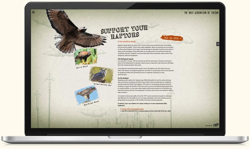 In addition to being an electric utility, Tucson Electric Power is one of the leading proponents of clean energy in the Southwest. They also help keep raptors from getting zapped by power lines. This cross-channel campaign illuminates of these stories and many others.